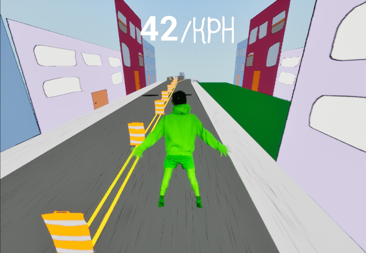Hello! Im Late is a third person fast paced momentum platformer where you are late for work. The only way to get to work faster is by doing tricks in the air.